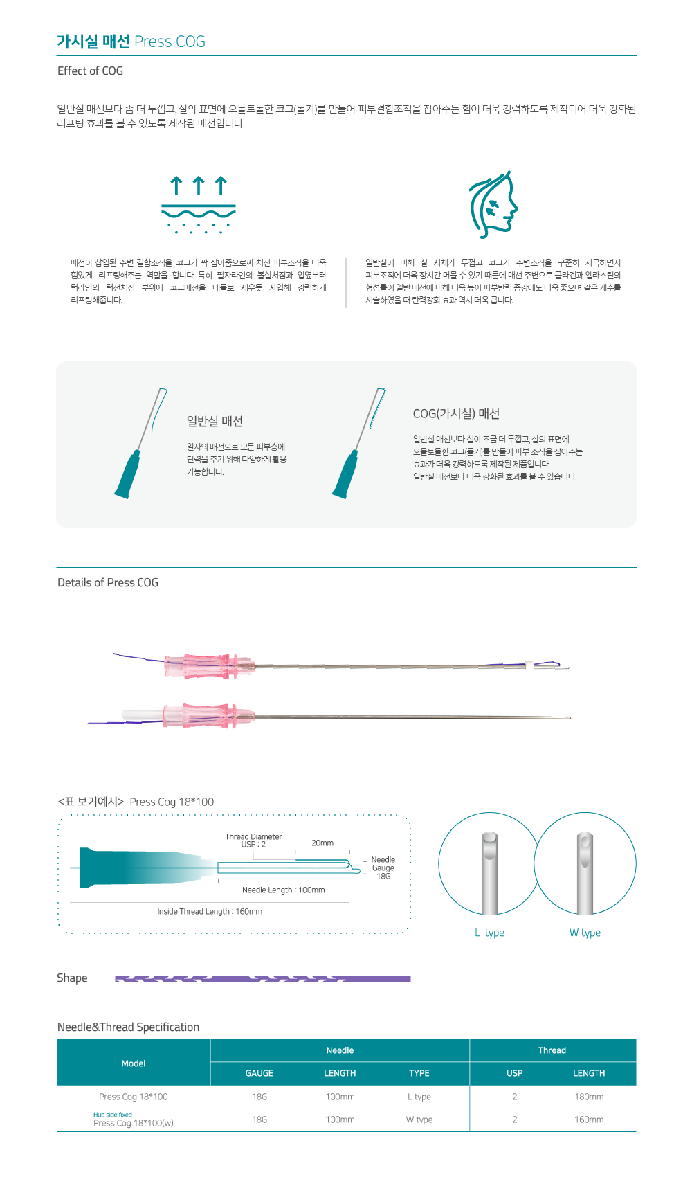주름개선 등의 목적으로 사용되기도 합니다. Cog(가시)가 형성되어있는 원사는 피부조직을 당기거나 고정시킬 때 (Lifting) 효과적으로 사용됩니다.